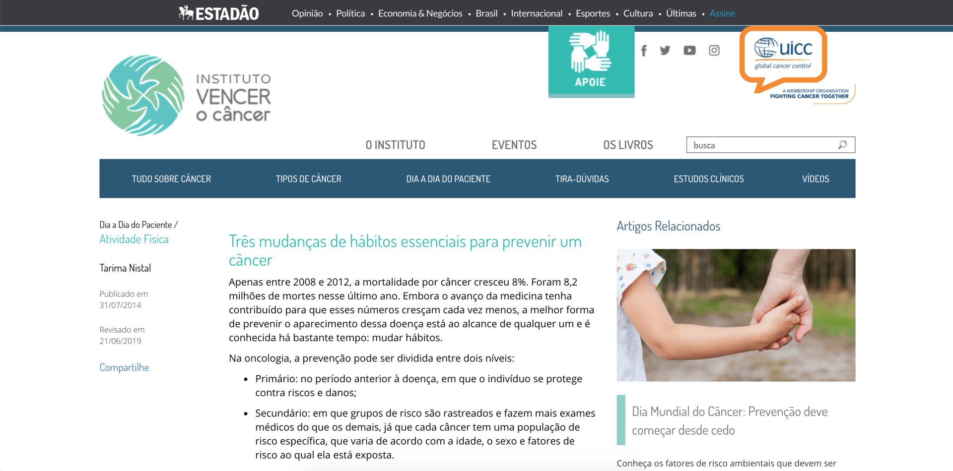 Segundo o Instituto Nacional do Câncer (INCA), cerca de 75% dos casos no mundo ocorrem a partir dos 65 anos e a estimativa de novos casos em 2020 é de 65.840.